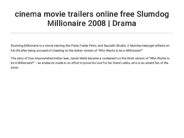 Cinema Movie Trailers Online Free Slumdog Millionaire 2008 Drama from cdn.slidesharecdn.com Slumdog millionaire is a movie which strangely doesn't understand its own material. Anil kapoor, dev patel, freida pinto and others. Jamal malik is an impoverished indian teen who becomes a contestant on the hindi version of 'who wants to be a millionaire?' but, after he wins, he is suspected of cheating. Trailer of the movie slumdog millionaire, made by myself. Jamal and his brother salim grew. 3 | presented in hd. Danny boyles drama slumdog millionaire ist der überragende sieger der 81. Slumdog millionaire, the cadillac people's choice award recipient from the 33rd annual toronto international film festival, has previewed a glimpse into its romantic comedy drama through newly released trailer.
